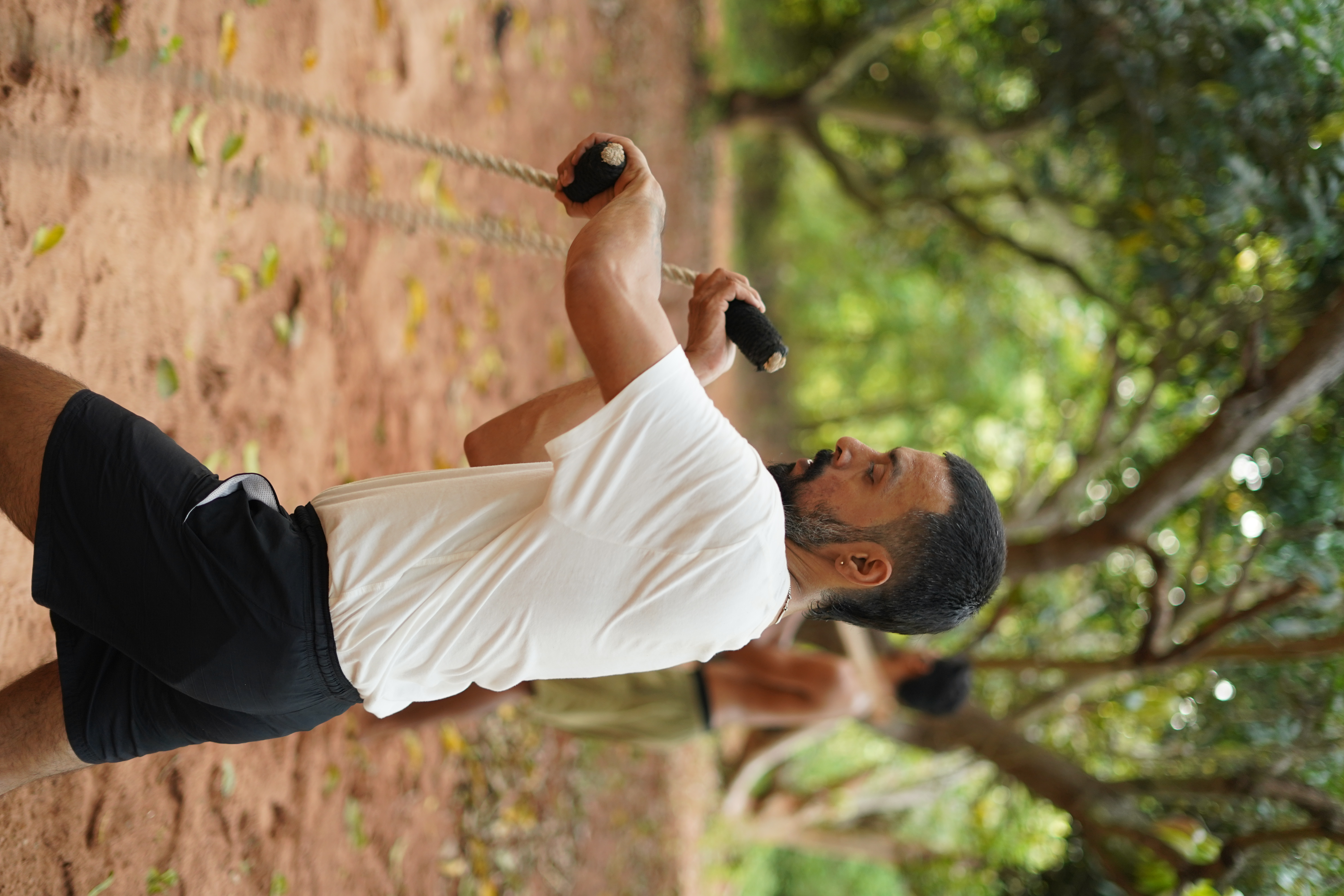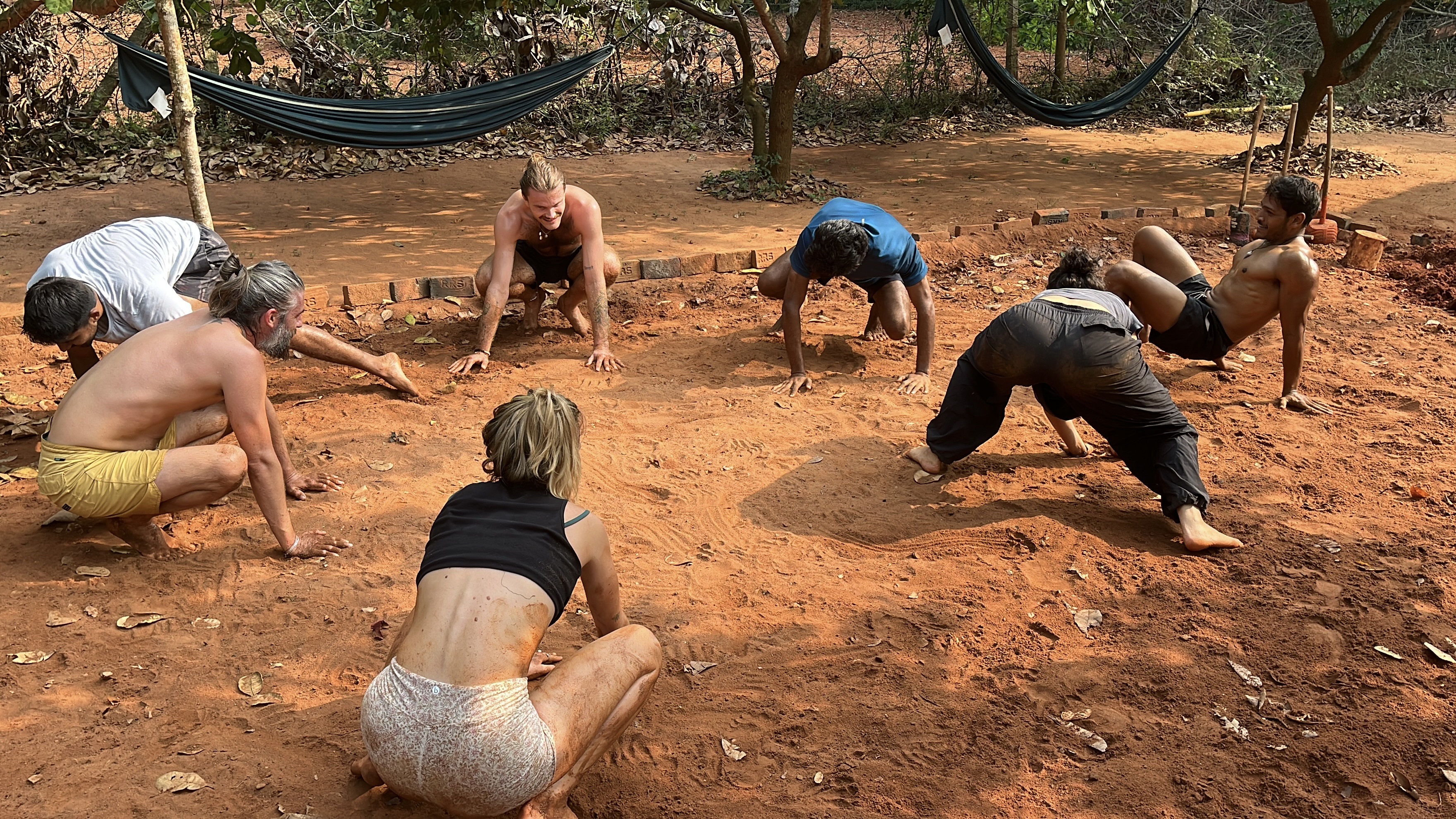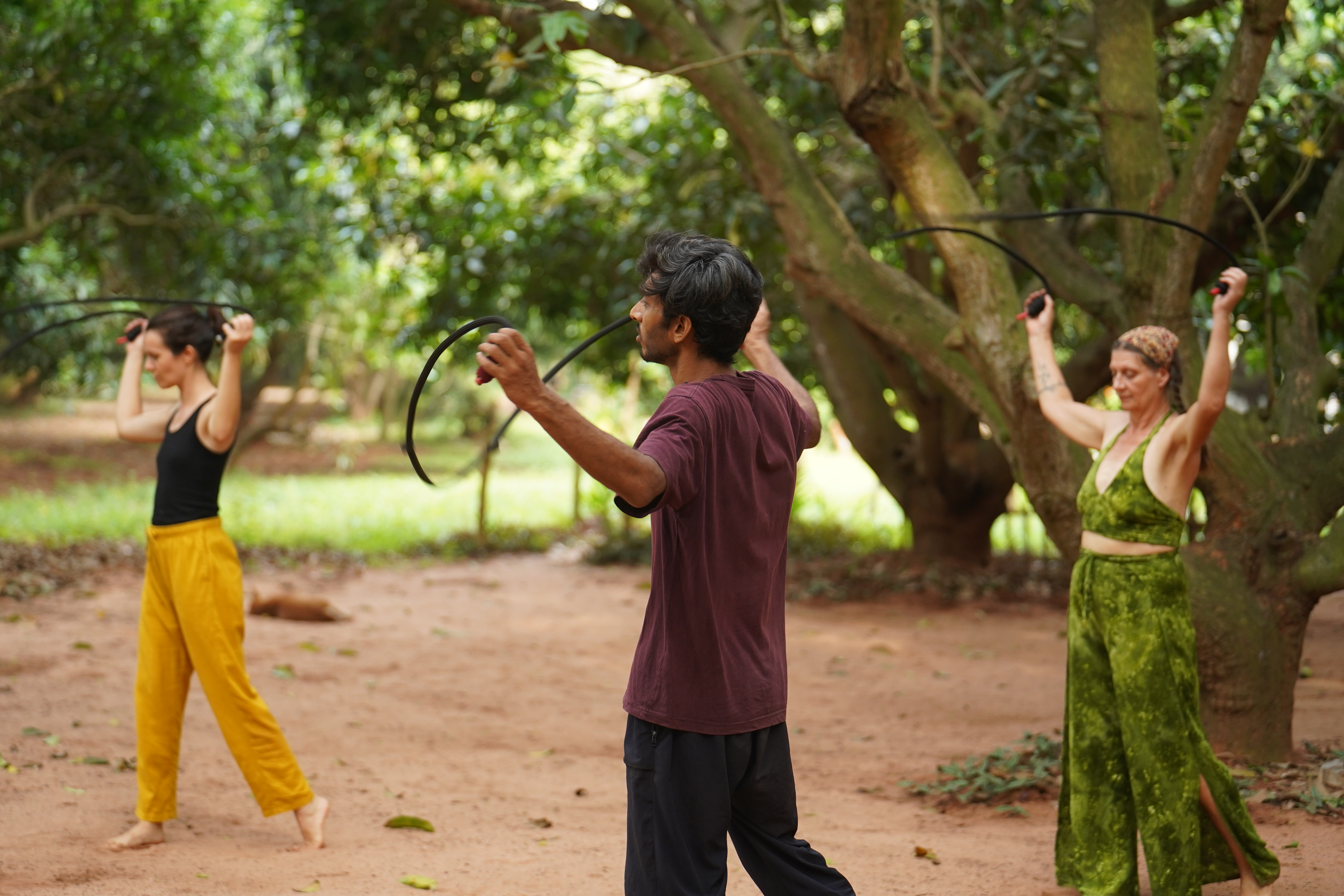 We play with rope flow, animal / ground flow, gada, mudgar and other indigenous tools. Each practice feeds the others — what you learn in one art translates into the next.